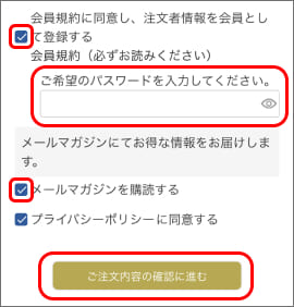 ご注文と同時に会員登録をされる場合は、ご希望のパスワードを入力してください。プライバシーポリシーをご確認の上、「ご注文内容の確認に進む」ボタンを押します。