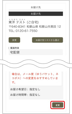 お届け先の住所にお間違いがないかご確認ください。お届け日時を指定される場合は、「お届け時間帯:指定なし」の右下にある「変更」ボタンを押して、ご希望の日時を選択します。