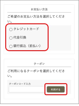 お支払い方法を選択します。クレジットカードの場合は、カード情報を入力してください。また、クーポンをお持ちの場合は、クーポンコードを入力の上、「利用する」ボタンを押します。